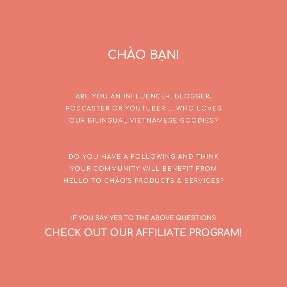 As a Hello To Chào affiliate, you will receive commissions from 10% per every sale. We offer a couple different options for you and you can choose which one works best for your brand. Commissions are paid automatically every month. You can track all your commissions and purchases when you log in to your affiliate account.