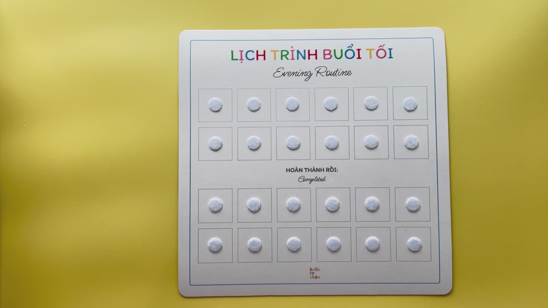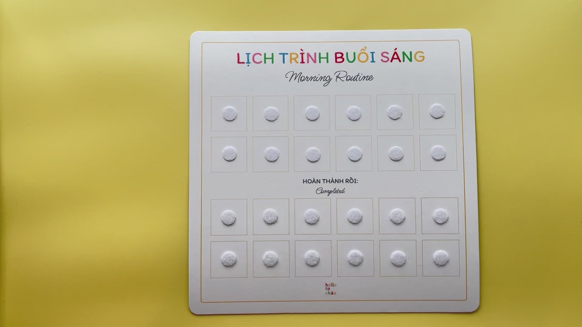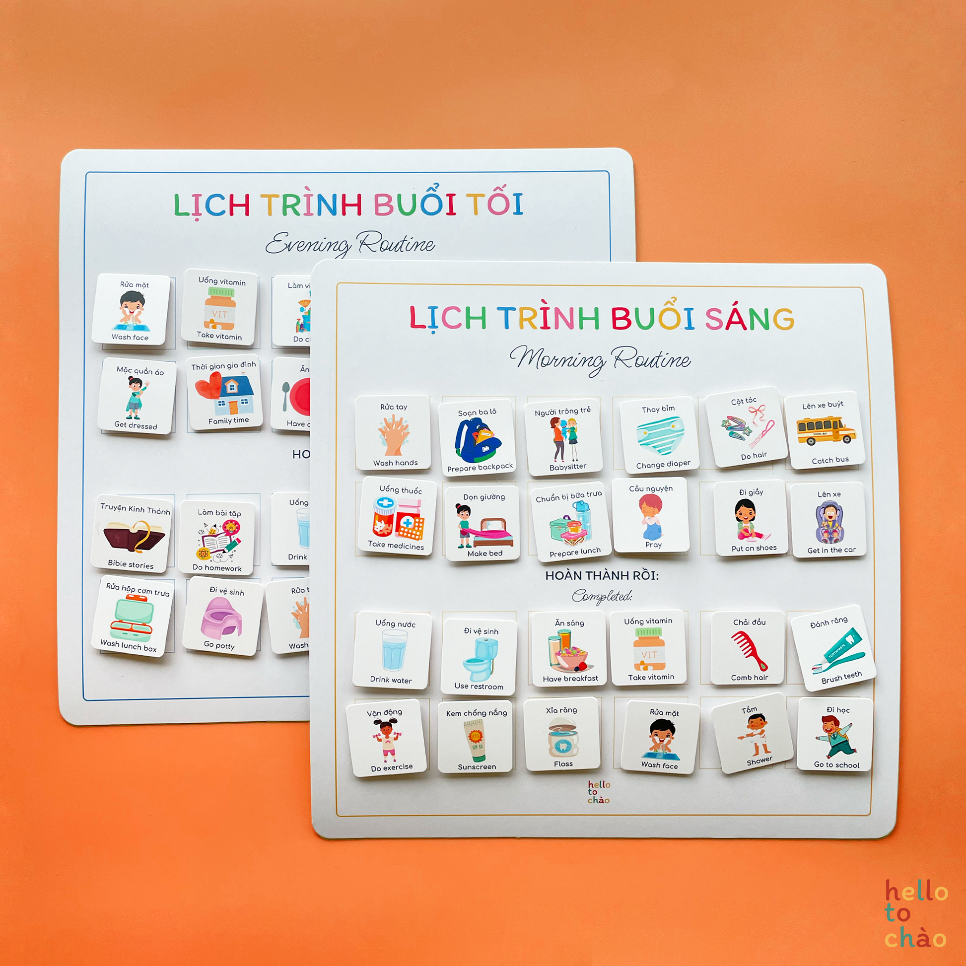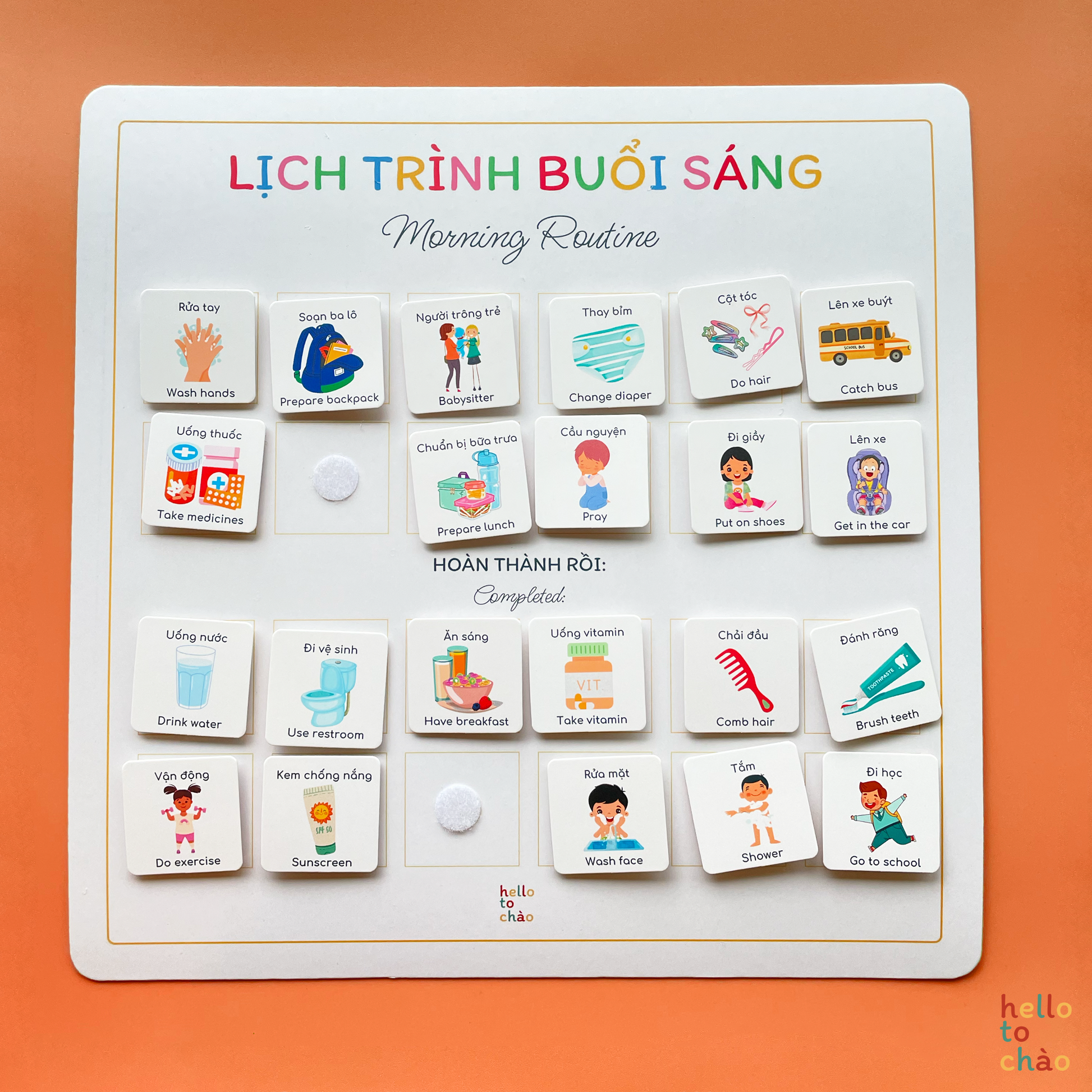 Using this routine set (as well as our chores and weekly planner) is a fun way to incorporate more Vietnamese into daily life at home while letting the kids have fun finishing their routines. How it works is, you stick the charts onto somewhere easily seen and reachable (we recommend the fridge or on the wall in little one's room), work together with the child to plan a routine that works for the family, then let them stick the routine cards onto the charts themselves. For every finished task, kids can move the cards down to the "completed" section.