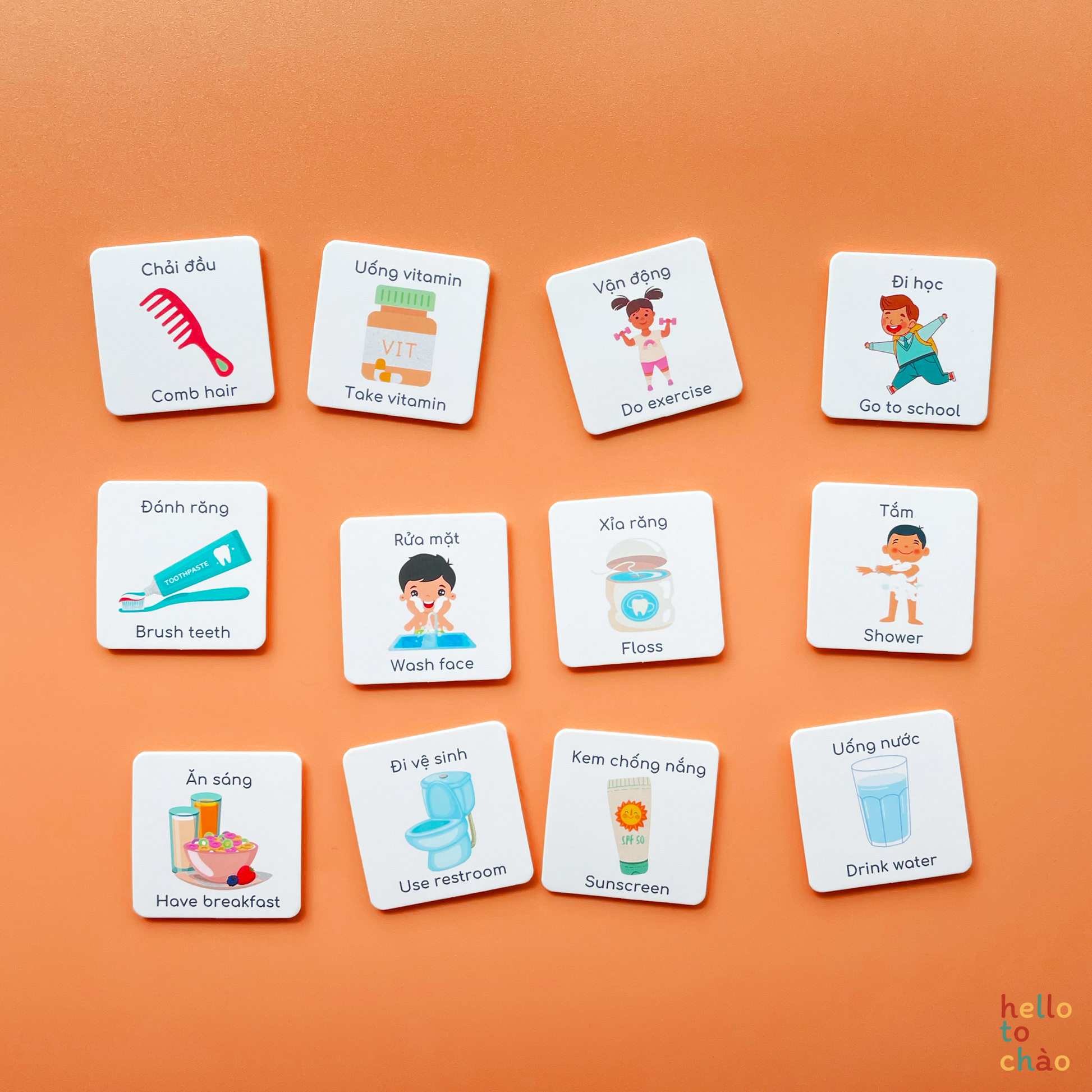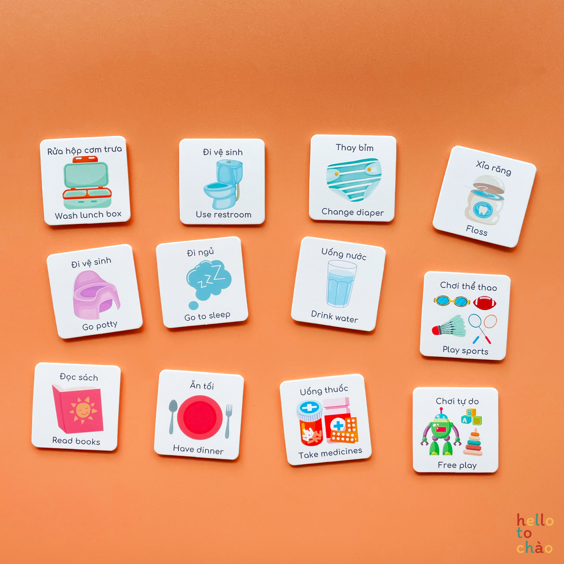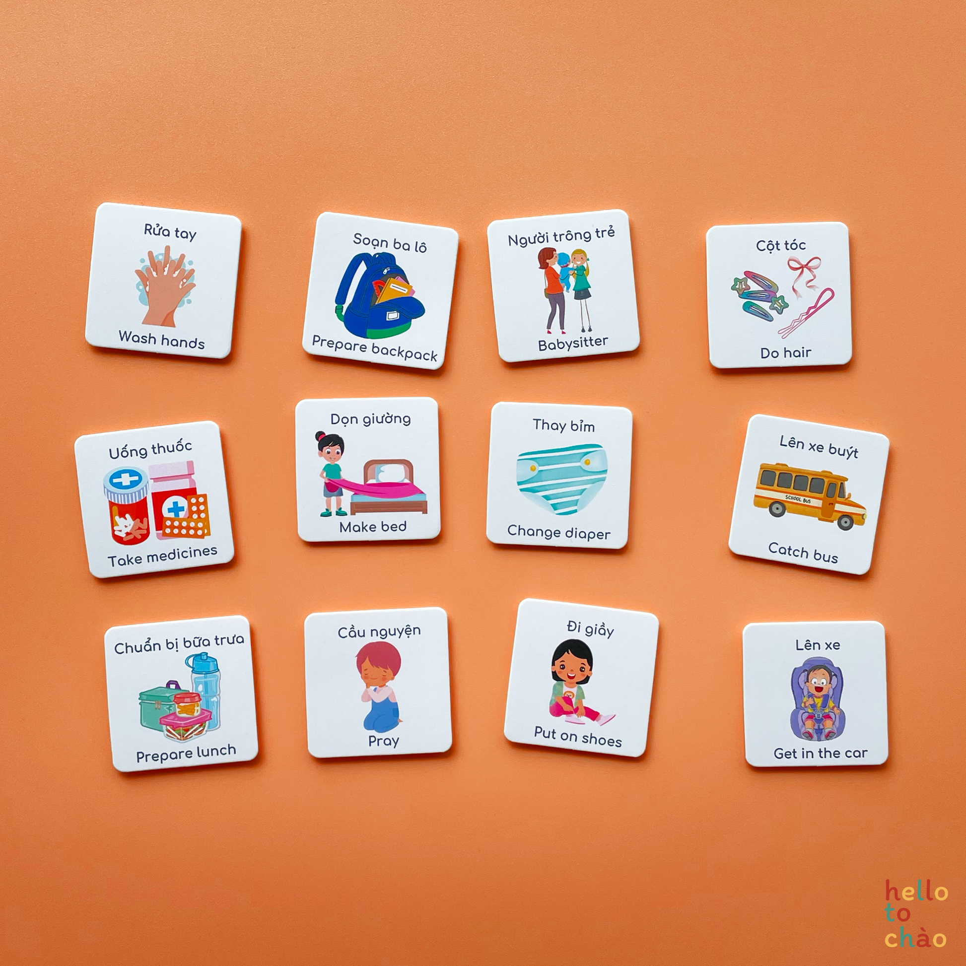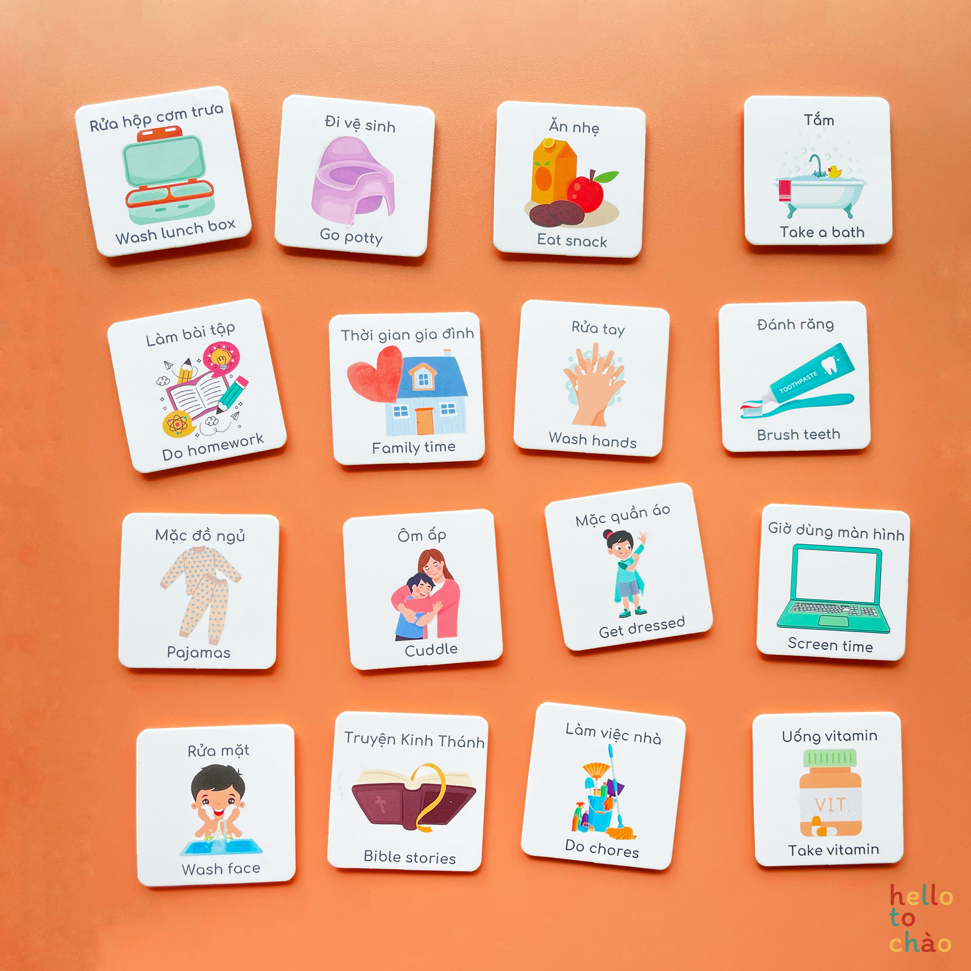 Using this routine set (as well as our chores and weekly planner) is a fun way to incorporate more Vietnamese into daily life at home while letting the kids have fun finishing their routines. How it works is, you stick the charts onto somewhere easily seen and reachable (we recommend the fridge or on the wall in little one's room), work together with the child to plan a routine that works for the family, then let them stick the routine cards onto the charts themselves. For every finished task, kids can move the cards down to the "completed" section.