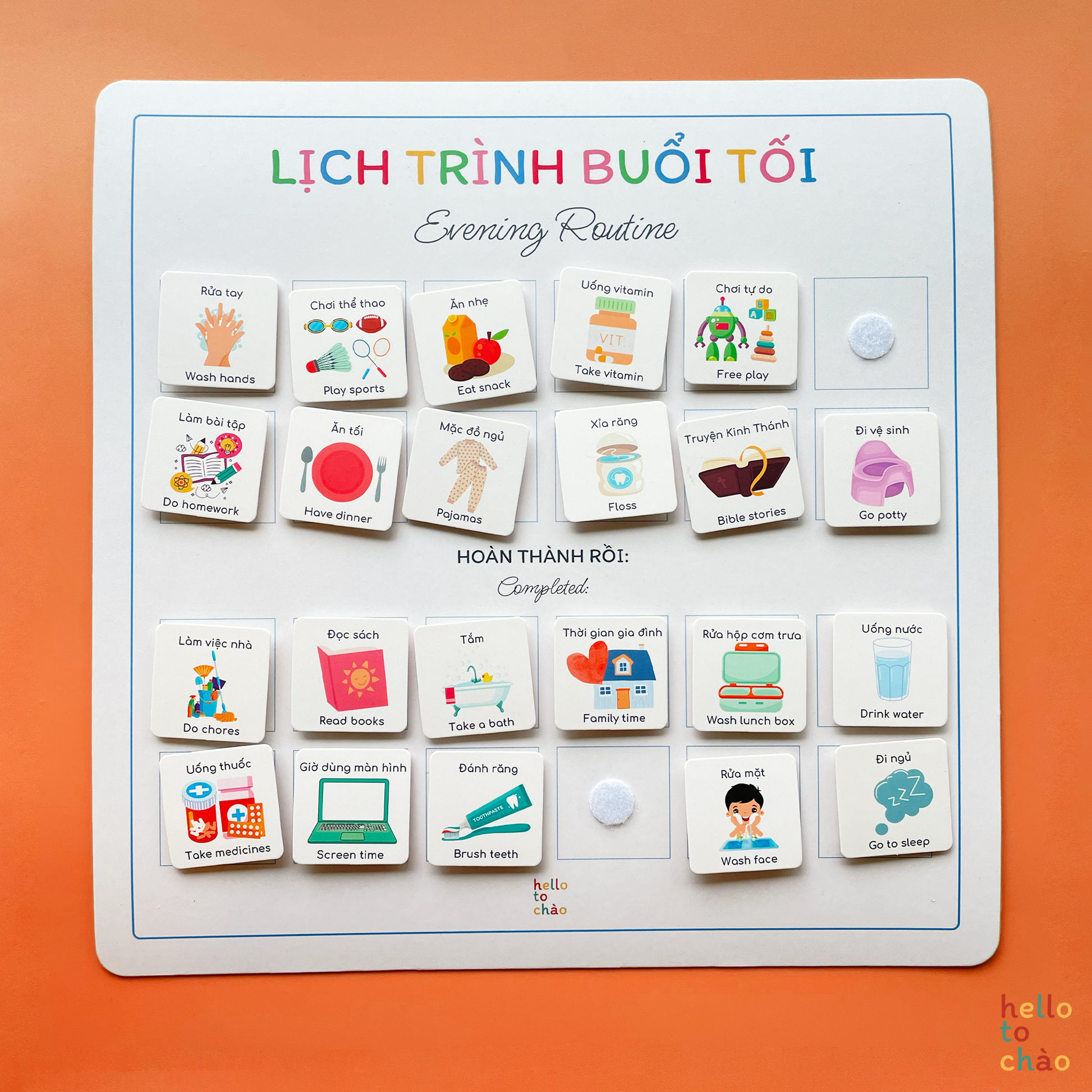 Đây là cách sáng tạo để khuyến khích các bé nói tiếng Việt nhiều hơn ở nhà. Cách làm là: ba mẹ dán bảng lên nơi nào đó dễ nhìn và vừa tầm với của bé (mình gợi ý dán lên tủ lạnh, hoặc lên tường trong phòng bé); rồi cùng bé lập lịch sinh hoạt sáng, tối phù hợp với gia đình, và để bé tự gắn thẻ lên bảng. Khi hoàn thành mỗi việc, bé có thể chuyển thẻ từ trên xuống phần "hoàn thành" trên bảng.