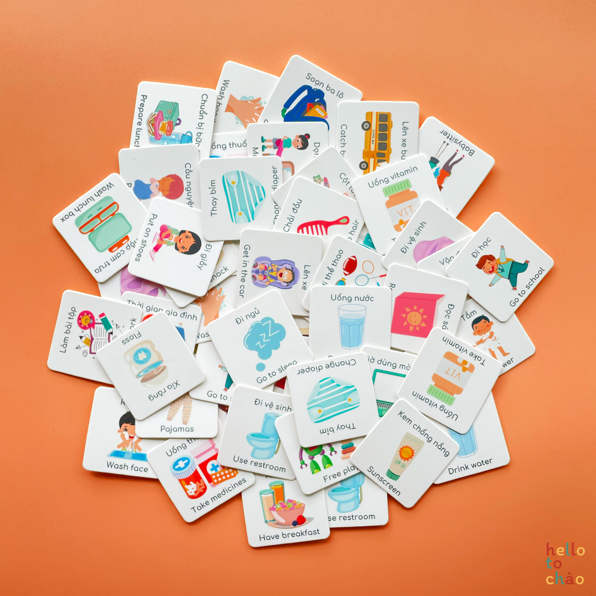 The charts and cards are printed on thick card stock and all corner-rounded. Each card has colorful image illustration and card titles in both English and Vietnamese. The set comes with velcro dots. You only need to stick the velcro dots to the cards and the chart and they're ready to use!